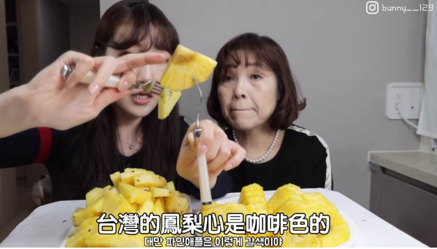 韓國(guó)YouTuber“寶妮和寶媽”稱臺(tái)灣的菠蘿心是咖啡色的,引發(fā)臺(tái)灣網(wǎng)友熱議。(圖/摘自寶妮和寶媽YouTube)