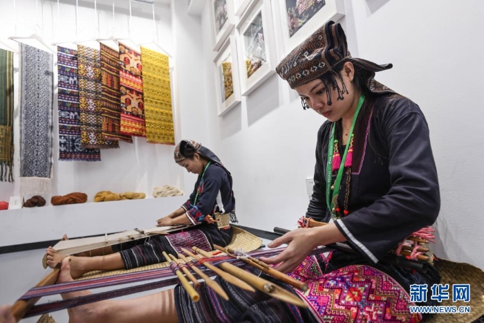 4月20日,匠人在博鰲亞洲論壇主題公園的展廳里織黎錦。