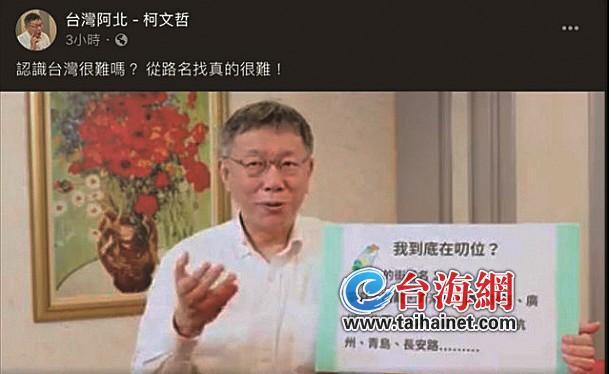 據(jù)稱由他好友創(chuàng)設的“臺灣阿北-柯文哲”臉書粉絲專頁,出現(xiàn)柯文哲親自錄制的影片,柯在影片中稱,臺北市許多道路都以大陸城市命名,“立法機構”還“淹沒”在大陸城市名稱中,他并拋出所謂臺北市街道“正名”話題。