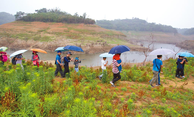 許多民眾25日進(jìn)入苗栗永和山水庫內(nèi),觀看干涸見底的庫區(qū),結(jié)果中午突然下起大雨,一群人趕緊撐傘撤離。臺(tái)灣氣象部門表示,華南云雨區(qū)25日東移,各地都有短暫降雨。(圖片來源臺(tái)灣《中國時(shí)報(bào)》)