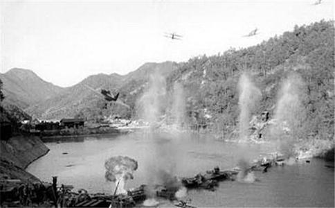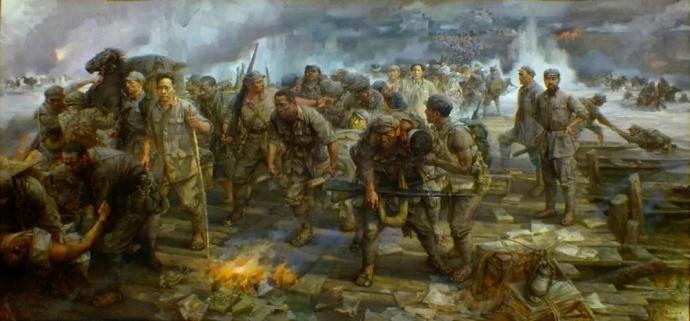 寬闊的江面上,濃烈的硝煙中,紅軍踩著早已磨穿的草鞋,行走在浮橋上。頭頂上,幾十架飛機轟炸著、掃射著,行進的隊伍中不斷有人倒下,落入江水,和著那些死亡的騾馬、散亂的文件、零落的鈔票、圓圓的斗笠……