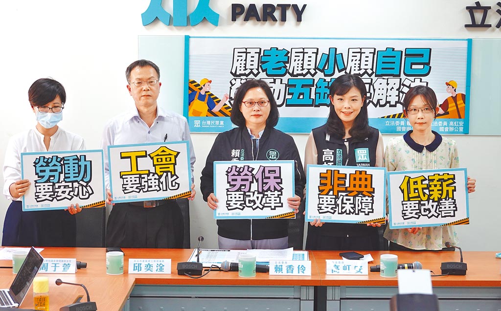 民眾黨“立委”高虹安(右二起)、賴香伶等人27日舉行“顧老顧小顧自己,勞動(dòng)5缺要解決”記者會(huì),針對(duì)改善勞工工作處境,提出勞保要改革、非典要保障、低薪要改善、工會(huì)要強(qiáng)化、勞動(dòng)要安心等建議。(姚志平攝/中國(guó)時(shí)報(bào)圖)