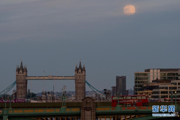 這是4月26日在英國倫敦拍攝的塔橋上空的“超級月亮”。