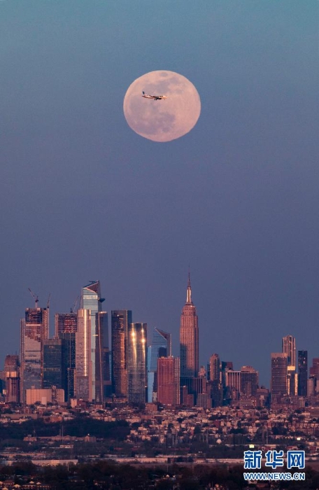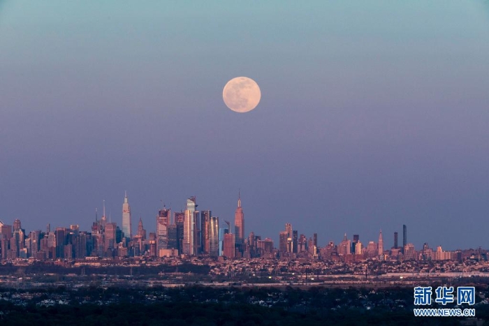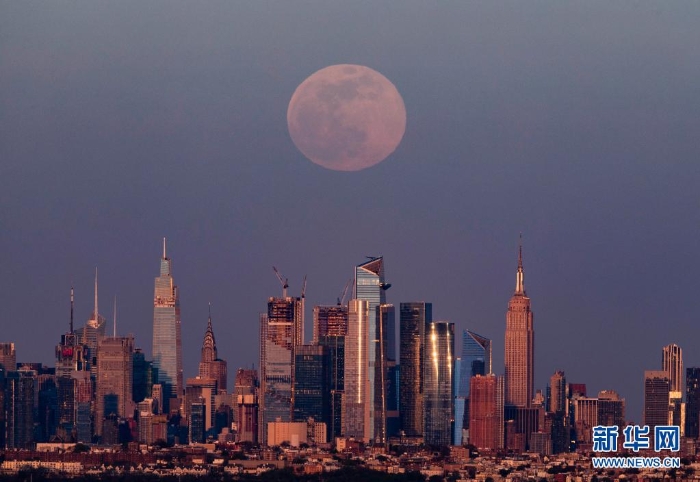 4月26日,“超級月亮”從美國紐約曼哈頓的天際線上升起。