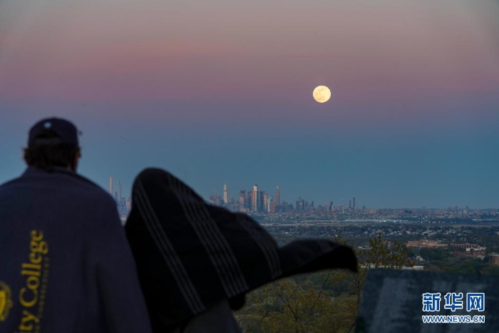 4月26日,人們在美國新澤西州西奧蘭治觀看“超級月亮”從紐約曼哈頓的天際線上升起。