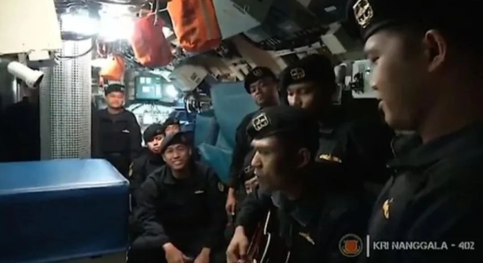 據(jù)英國(guó)廣播公司(BBC) 26日?qǐng)?bào)道,印尼海軍發(fā)布了一段沉沒(méi)潛艇艇員早前在潛艇里面唱歌的心酸視頻。這段在幾周前拍攝的視頻顯示,艇員們?cè)诔《饶嵛鱽啛衢T(mén)歌曲“Sampai Jumpa”(直到我們?cè)俅蜗嘤?。
