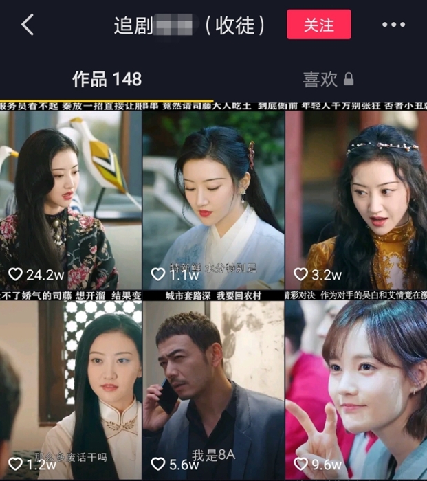 某博主依托剪輯熱門古裝劇“攬粉”,圖為該博主主頁截圖。(來源:新華社)