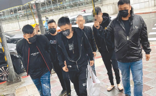 涉嫌槍擊媽祖文化協(xié)會主嫌楊志豪,綽號楊鳩(手提白色紙袋、中)與郭旻峻(左側(cè),穿牛仔褲)綽號大郭,29日上午主動到北投警分局投案。(圖片來源:臺灣《中國時報》)