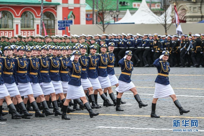 5月9日,在俄羅斯莫斯科舉行的勝利日閱兵式上,女兵列隊(duì)走過(guò)紅場(chǎng)。新華社發(fā)(葉甫蓋尼·西尼岑攝)