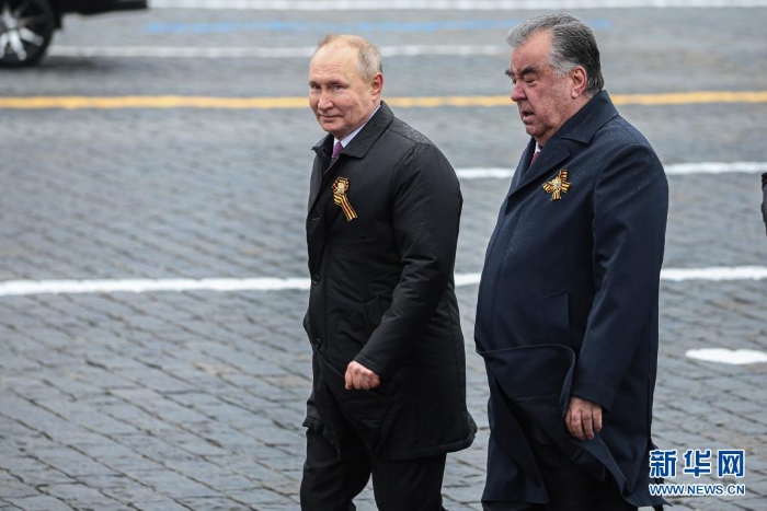 5月9日,在俄羅斯首都莫斯科,俄羅斯總統(tǒng)普京(左)和塔吉克斯坦總統(tǒng)拉赫蒙在閱兵式后走過(guò)紅場(chǎng)。新華社發(fā)(葉甫蓋尼·西尼岑攝)
