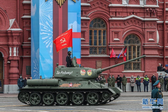 5月9日,在俄羅斯莫斯科舉行的勝利日閱兵式上,T-34型坦克駛過(guò)紅場(chǎng)。新華社發(fā)(葉甫蓋尼·西尼岑攝)
