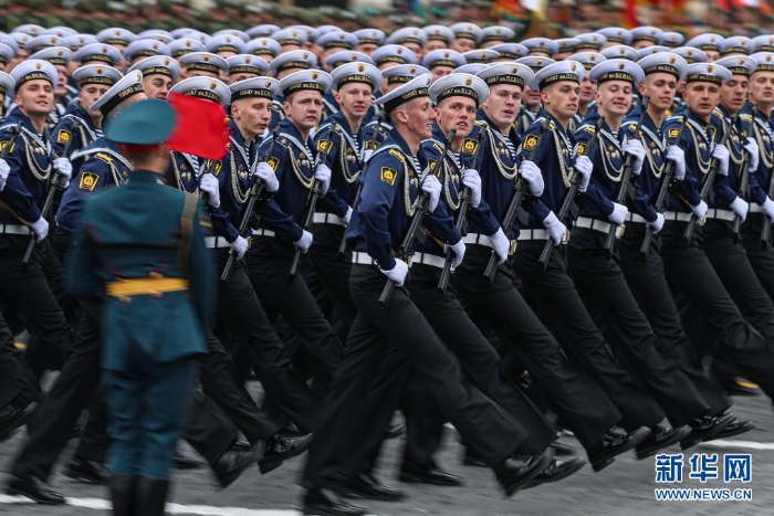 5月9日,在俄羅斯莫斯科舉行的勝利日閱兵式上,儀仗兵走過(guò)紅場(chǎng)。新華社發(fā)(葉甫蓋尼·西尼岑攝)
