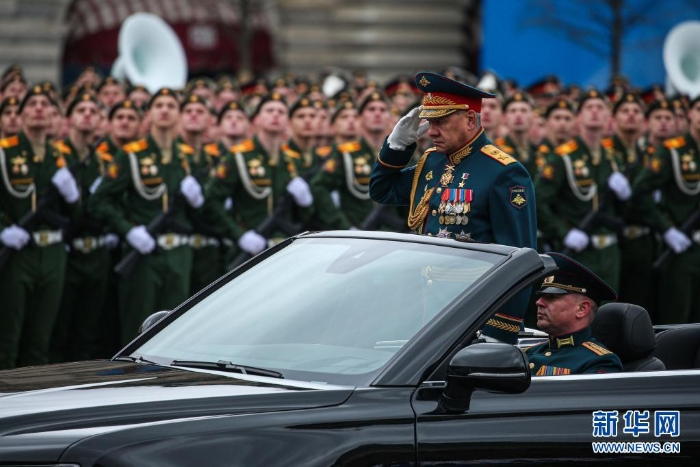 5月9日,在俄羅斯莫斯科舉行的勝利日閱兵式上,俄國(guó)防部長(zhǎng)紹伊古檢閱部隊(duì)。新華社發(fā)(葉甫蓋尼·西尼岑攝)