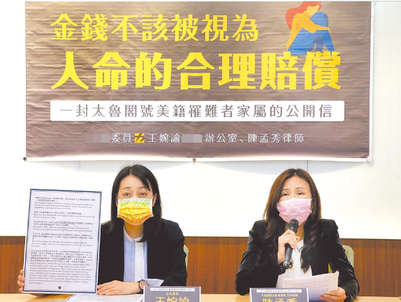 “立委”王婉諭(左)和律師陳孟秀(右)代讀美籍罹難者家屬的中文譯文公開信,表示要對臺鐵的法律責任追究到底。(圖片來源:臺灣《中國時報》)