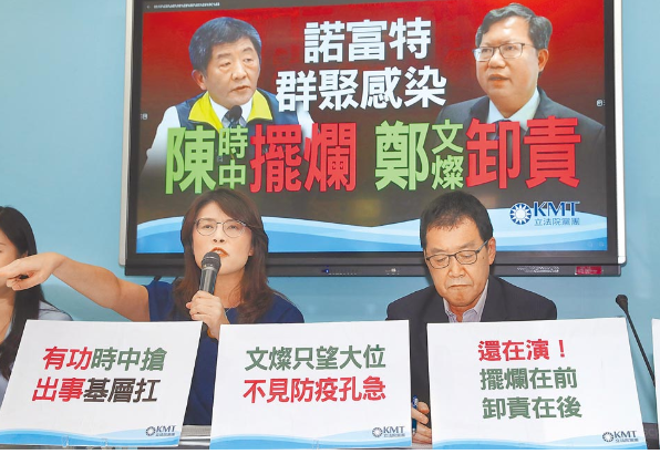 國(guó)民黨黨團(tuán)10日舉行“諾富特群聚感染,陳時(shí)中擺爛、鄭文燦卸責(zé)”記者會(huì),痛批從臺(tái)當(dāng)局、地方到民航部門及華航的螺絲都松了,要求臺(tái)衛(wèi)福部門主管陳時(shí)中與行政機(jī)構(gòu)負(fù)責(zé)人蘇貞昌檢討指揮中心的現(xiàn)行機(jī)制。(圖片來源:臺(tái)灣《中時(shí)電子報(bào)》)