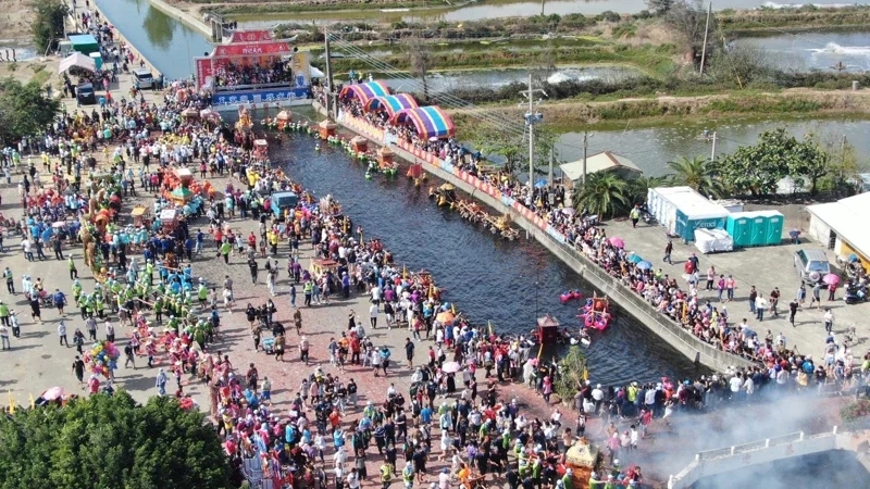 參加嘉義縣新塭嘉應廟“沖水路、迎客王”群眾多達數(shù)千人,空拍場面壯觀。圖/呂竑毅提供