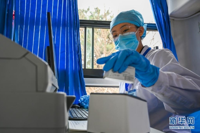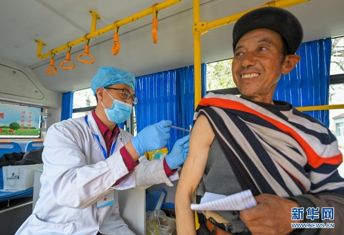 5月13日,在大榆樹鄉(xiāng)大榆樹村,醫(yī)務人員在流動接種車內(nèi)為村民接種。