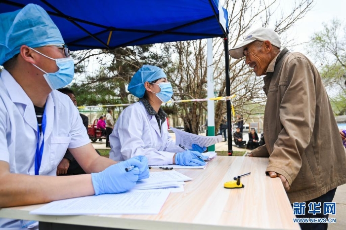 5月13日,在大榆樹鄉(xiāng)大榆樹村,醫(yī)務人員為準備接種新冠疫苗的村民測量血壓。