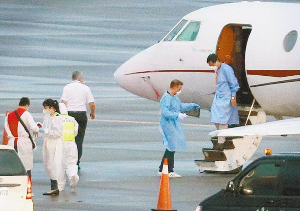 圖為臺(tái)灣地區(qū)“駐印度代表處”官員8日搭乘醫(yī)療專(zhuān)機(jī)飛抵桃園機(jī)場(chǎng)。(圖片來(lái)源:臺(tái)灣《中時(shí)電子報(bào)》)
