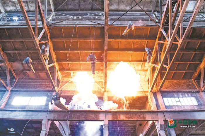 混編作戰(zhàn)小組隊員在廠房內(nèi)索降突襲。