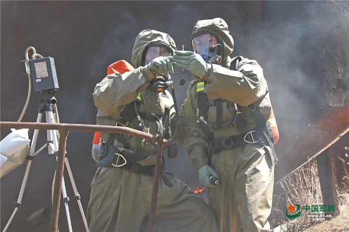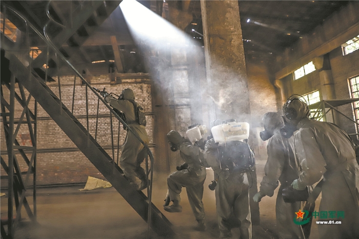 “3名‘暴恐分子’藏匿于化工廠二樓!”晨曦微露,偵察隊員段鳳喬一邊報告?zhèn)刹烨闆r,一邊掩護防化分隊戰(zhàn)友對廠區(qū)泄漏化學(xué)物質(zhì)進行處理。