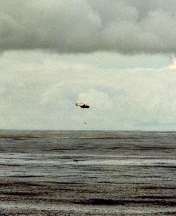 這是從太平洋上的中國打撈船起飛的直升機,正在將潛水員以及他打撈的儀器艙一起吊上機艙(資料照片)。新華社發(fā)