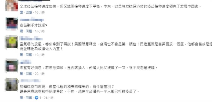 此消息曝光后,不少網(wǎng)友在臺媒《中時新聞網(wǎng)》和Yahoo平臺的相關(guān)新聞報導(dǎo)下方留言表示意見,表示“還沒收到再講都是沒用”、“根本還沒爭取到”、“等疫苗到臺灣,人民才會相信”、“萬一沒來呢?”“空氣場的放風(fēng),等你拿到了再說”、“疫苗到手才說吧”、“麻煩再請美國送電、送水過來”。