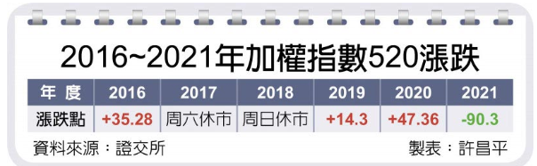 2016~2021年加權(quán)指數(shù)520漲跌。圖片來(lái)源:臺(tái)灣《中國(guó)時(shí)報(bào)》
