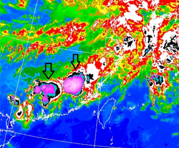 衛(wèi)星云圖觀測到紫色的團狀云塊,代表梅雨季最常帶來的強降雨系統(tǒng)開始活躍起來了!(圖片來源:臺灣《中時電子報》)