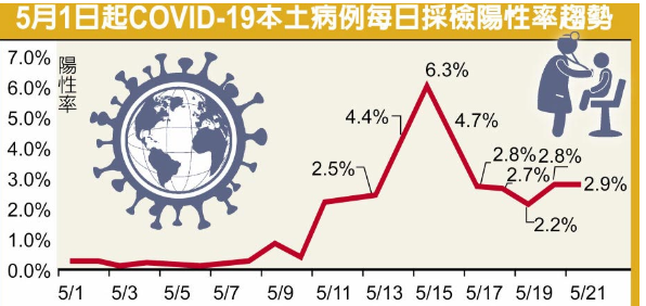 5月1日起COVID-19本土病例每日采檢陽性率趨勢。圖片來源:臺灣《中國時報》