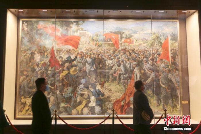 參觀者在井岡山革命博物館內(nèi)觀看油畫作品《井岡山會師》。(來源:中新網(wǎng))