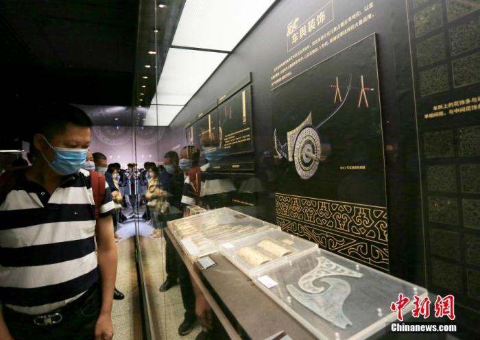 民眾在甘肅省博物館參觀馬家塬出土的車馬飾、車馬器。(來源:中新網(wǎng))