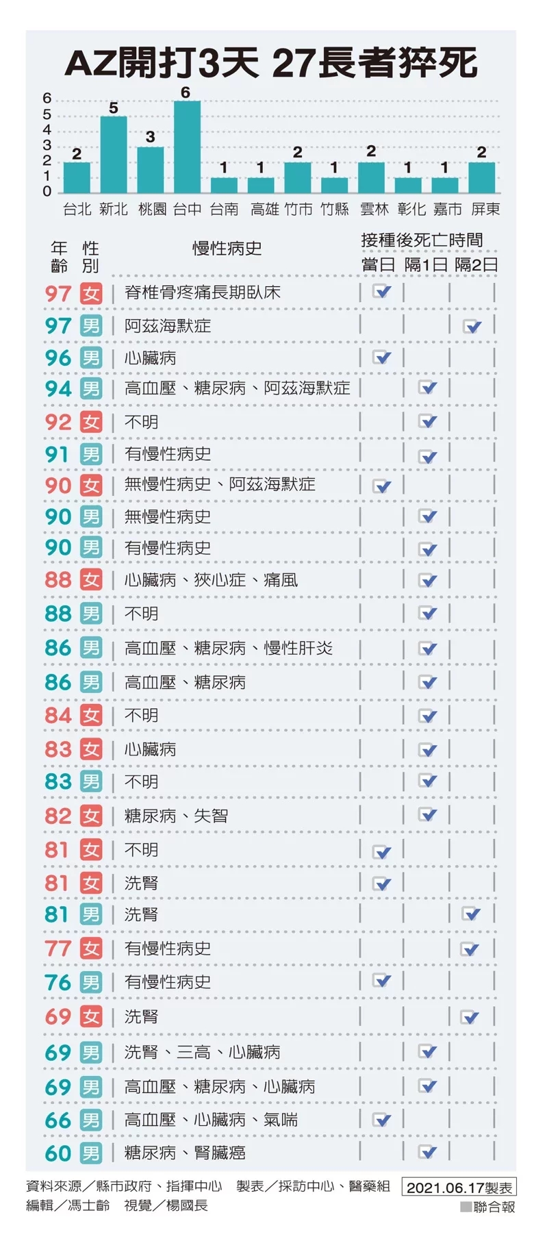 島內(nèi)AZ疫苗大規(guī)模接種以來,已傳出多起長者返家猝死案例,截至17日晚已有27起。雖然目前還無法證實死因與疫苗有關,但已嚴重影響民眾信心。匯整猝死案例資料后,發(fā)生地遍布全臺,而以臺中市6起為最多;約半數(shù)有慢性病史,男性又比女性多。