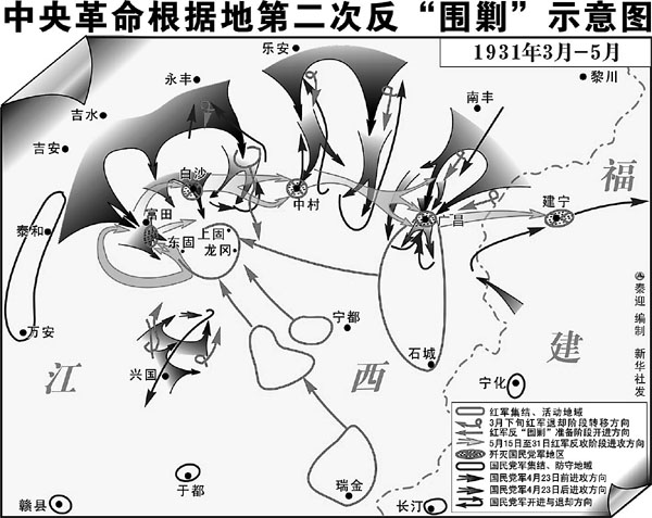 中共蘇區(qū)中央局針對反“圍剿”的方針和紅軍作戰(zhàn)方向問題進(jìn)行了多次討論,最終采納了毛澤東的正確主張。紅一方面軍3萬余人在毛澤東、朱德指揮下,繼續(xù)采取“誘敵深入”的方針,退至蘇區(qū)前部龍岡、東固地區(qū)隱蔽集結(jié),持重待機。隨后,采取集中兵力,先打弱敵,并在運動中各個殲滅敵人的戰(zhàn)法,從5月16日至5月30日,由西向東橫掃,在富田、白沙、中村、廣昌、建寧連打5個勝仗,轉(zhuǎn)戰(zhàn)700余里,殲敵3萬人,繳槍2.2萬支,不僅粉碎了國民黨軍的第二次“圍剿”,還乘勝轉(zhuǎn)入進(jìn)攻,占領(lǐng)贛東、閩西北廣大地區(qū),進(jìn)一步鞏固和擴(kuò)大了中央蘇區(qū)。