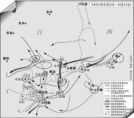 毛澤東毅然決定千里回師,率紅軍主力從建寧出發(fā),到贛南興國集中。隨后,紅一方面軍和從贛江以西東渡的紅七軍會(huì)合。8月初,部隊(duì)集中在以高興圩為中心的方圓幾十里的地區(qū)。各路敵軍紛紛逼近,形成對(duì)紅軍半包圍的態(tài)勢(shì)。紅軍從敵軍中間40里的空隙地帶向東突進(jìn),從8月7日到11日在蓮塘、良村、黃陂,三戰(zhàn)三捷,殲敵1萬余人。敵人發(fā)現(xiàn)我軍在黃陂地區(qū)后,集中主力與我決戰(zhàn)。紅一方面軍以一部兵力向東北方向佯動(dòng),調(diào)動(dòng)敵人,主力向西急進(jìn),使敵疲于奔命。在我軍的不斷打擊下,敵被我拖得疲憊不堪,已無力再戰(zhàn),蔣介石被迫于9月初下令“圍剿”軍總退卻。毛澤東、朱德令紅軍發(fā)起反擊,取得老營盤、方石嶺戰(zhàn)斗的勝利,粉碎了國民黨軍的第三次“圍剿”。至9月15日,紅一方面軍共擊潰敵人7個(gè)師,殲敵17個(gè)團(tuán),斃傷俘敵3萬余人,繳槍2萬余支。