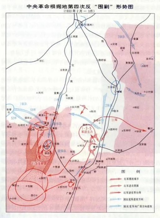 陳誠被迫調(diào)整其中路軍部署,將“分進(jìn)合擊”改為“中間突破”,將6個(gè)師分成前后兩個(gè)縱隊(duì),向廣昌方向進(jìn)攻,企圖攻占廣昌,誘使紅軍主力與其決戰(zhàn)。紅一方面軍以第11軍進(jìn)至廣昌西北地區(qū),吸引敵人前縱隊(duì)加速南進(jìn),以主力向北移動(dòng),準(zhǔn)備側(cè)擊敵之后縱隊(duì)。