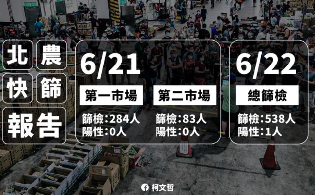 柯文哲公布最新北農(nóng)確診人數(shù),加上校正回歸七例及今天兩例,北農(nóng)從5月14日至今,已經(jīng)確診54人,另外,這兩天的快篩結(jié)果,柯說,北農(nóng)專案總篩檢人數(shù)538人,結(jié)果陽性一人,6月21日第一市場(chǎng)篩檢284人、第二市場(chǎng)篩檢 83人,陽性均0人。