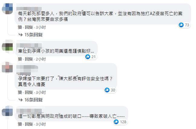 【華夏經(jīng)緯網(wǎng)報道】自臺灣開放接種AZ疫苗以來,已傳出近百的死亡案列,據(jù)臺灣《聯(lián)合報》報道,臺灣云林縣發(fā)生第一樁疑似母親昨天施打完AZ疫苗,回家哺乳喂食兩個月大女嬰母乳,今天早上發(fā)現(xiàn)女嬰猝死。至于女嬰死因是否與母親接種疫苗有關(guān),仍待進一步查驗。此外,臺灣疫苗廠商高端公司緊急加快生產(chǎn)腳步,打算略過三期臨床試驗,再次引發(fā)了島內(nèi)民眾對施打疫苗的恐慌情緒,島內(nèi)多名學者、藝人喊話民進黨當局,放下政治偏見,兩岸聯(lián)合抗疫。 島內(nèi)網(wǎng)友痛心表示,“每天都死那么多人,民進黨當局還可以告訴大家,并沒有因為施打AZ疫苗死亡的案例?臺灣民眾要自求多福”、“孕婦接下來要打了,陳時中有評估安全性嗎?”、“這一切都是民進黨當局造成的坡口,導(dǎo)致家破人亡”…… 臉書網(wǎng)友留言截圖