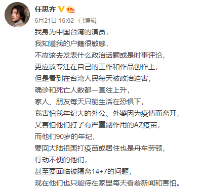 自嘲“沒有名氣的小演員”的臺灣藝人任思齊在個人微博上表示自己6月中旬剛在上海接種完疫苗,他看到在臺灣人民每天被政治迫害,確診和死亡人數(shù)都一直往上升,家人、朋友每天只能生活在恐懼下,“害怕我年紀大的外公、外婆因為疫情而離開,又害怕他們打了有嚴重副作用的AZ疫苗”,此外,他還提到“在大陸有將近8萬臺胞打了大陸疫苗,并沒有任何人因為這疫苗而死亡”,呼吁更多有影響力的臺胞們,“不管是臺商、企業(yè)家、教育家等等…或是藝人、歌手、演員,希望大家站出來,幫助臺灣渡過疫情。更希望有影響力的你們可以告訴臺灣民眾,祖國大陸并沒有迫害你們,真正迫害臺灣人民的就是臺灣的政客?!?/span> 圖片來源:微博截圖