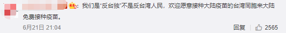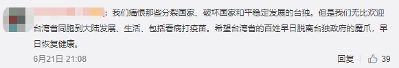 大陸網(wǎng)友紛紛熱心回復(fù),歡迎愿意接種大陸疫苗的臺灣同胞來大陸:“我們是反'臺獨'不是反臺灣人民”、“心疼臺灣同胞!生死存亡!”、“我們痛恨那些分裂國家、破壞國家和平穩(wěn)定發(fā)展的'臺獨',但是我們無比歡迎臺灣同胞到大陸發(fā)展、生活、包括看病打疫苗”…… 網(wǎng)友留言截圖