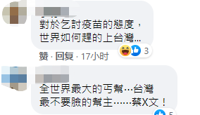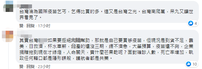 國(guó)臺(tái)辦發(fā)言人馬曉光也在21日的記者會(huì)上表示,臺(tái)灣此輪疫情肆虐已一個(gè)多月,嚴(yán)重危及廣大臺(tái)灣同胞生命健康安全。截至6月21日,臺(tái)灣新冠肺炎確診病例累計(jì)14080例,死亡569例,染疫死亡率超過4%,目前島內(nèi)疫苗接種率僅約6%。我們對(duì)當(dāng)前臺(tái)灣疫情和廣大臺(tái)灣同胞生命健康安全十分憂慮,多次表示愿盡最大努力協(xié)助廣大臺(tái)灣同胞戰(zhàn)勝疫情,讓廣大臺(tái)灣同胞盡快有疫苗可用,愿意提供被世界衛(wèi)生組織納入全球“緊急使用清單”的大陸疫苗,或上海復(fù)星醫(yī)藥集團(tuán)參與研發(fā)和代理的德國(guó)BNT疫苗,上海、江蘇、福建的民間機(jī)構(gòu)還宣布要為島內(nèi)捐贈(zèng)一批疫苗。 馬曉光說,我們希望看到并愿積極協(xié)助廣大臺(tái)灣同胞早日戰(zhàn)勝疫情。但遺憾的是,民進(jìn)黨當(dāng)局卻大搞“政治防疫”,無視島內(nèi)民眾生命健康,無視大陸善意,將疫苗賦予政治顏色,不斷頑固進(jìn)行政治操弄,延續(xù)制造兩岸對(duì)抗的政治戲碼,廣大臺(tái)胞仍無法從大陸得到安全、有效和足量的疫苗,島內(nèi)有效防疫的寶貴時(shí)間一再流失。利用疫苗搞政治,就是對(duì)廣大臺(tái)灣民眾生命健康的極端不負(fù)責(zé)任和無端戕害。 島內(nèi)民眾也紛紛嘲諷,“對(duì)于乞討疫苗的態(tài)度,世界如何趕得上臺(tái)灣”、“全世界最大的丐幫,臺(tái)灣” 還有民眾認(rèn)為,接受疫苗捐贈(zèng)是“無能的表象”、“臺(tái)灣淪為國(guó)際疫苗乞丐,乞得比買得多,這又是臺(tái)灣之光”……