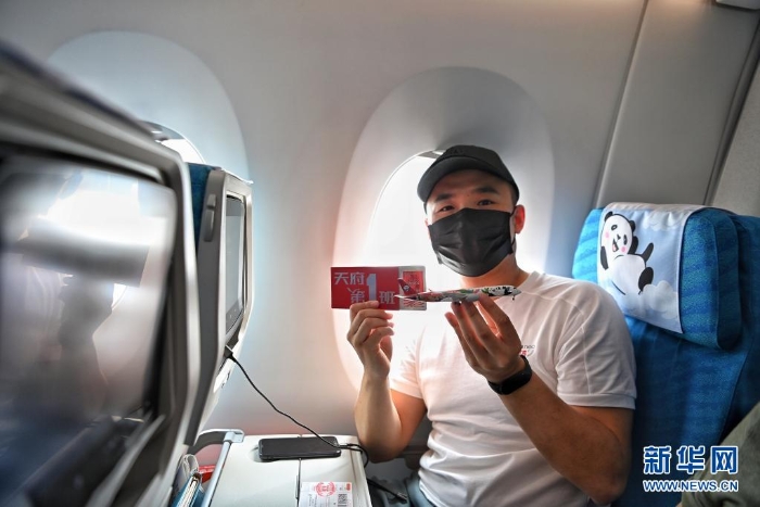 6月27日,在成都天府國際機場,搭乘四川航空公司3U8001航班的旅客展示首航紀念飛機模型和登機牌。