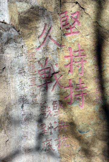 1941年八路軍挺進(jìn)軍在北京妙峰山留下的摩崖石刻:“堅(jiān)持持久戰(zhàn)”、“堅(jiān)決抗戰(zhàn)到底”。圖源:中國(guó)軍網(wǎng)-解放軍報(bào)