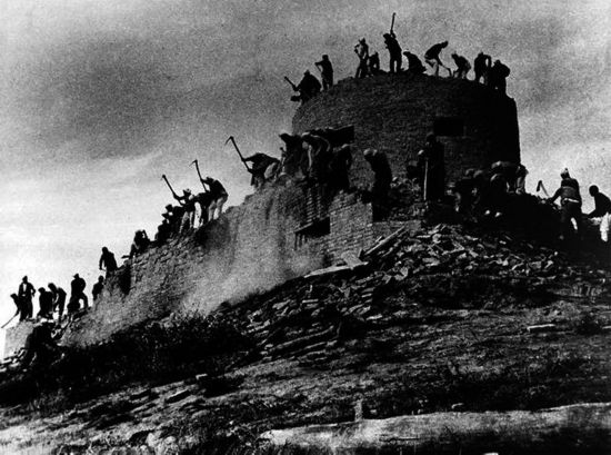 1940年百團(tuán)大戰(zhàn)后,八路軍在太行山拆除日軍防御工事。 圖源:陜西日?qǐng)?bào)