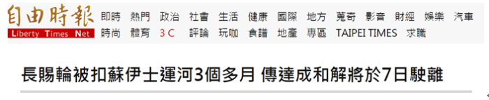 臺(tái)灣《自由時(shí)報(bào)》消息,臺(tái)灣長榮海運(yùn)承租貨輪“長賜輪”(Ever Given)今年3月在蘇伊士運(yùn)河擱淺,導(dǎo)致航道癱瘓,最新消息稱,長賜輪與蘇伊士運(yùn)河管理局已達(dá)成和解,預(yù)計(jì)將于本月7日駛離。
