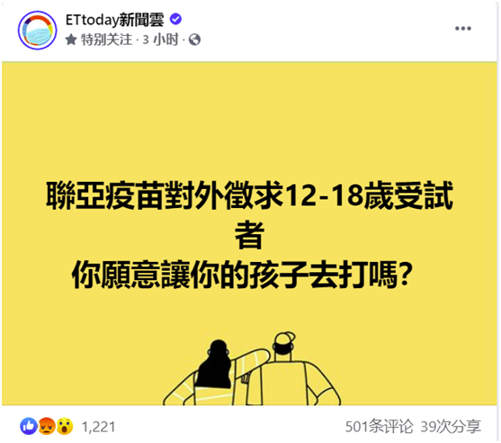 聯(lián)亞疫苗對外召募12到18歲青少年受試者,家長們是否愿讓自己的孩子去打?4日上午9時,臺灣“ETtoday新聞云”在臉書發(fā)起網(wǎng)絡(luò)調(diào)查。截至12時20分記者發(fā)稿,這項調(diào)查下的留言已超過500條。盡管有少數(shù)人表示愿意讓孩子去當(dāng)受試者,但大多數(shù)網(wǎng)友表示不愿意。