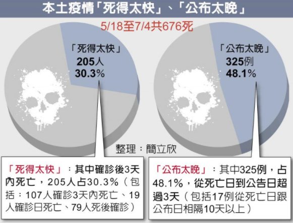 臺(tái)灣本土新冠疫情至7月4日累計(jì)確診1萬(wàn)3795人、死亡680人,致死率4.93%,高于世界平均2倍以上,而接種疫苗后死亡數(shù)也達(dá)到281人。臺(tái)灣《中國(guó)時(shí)報(bào)》梳理5月11日至今676個(gè)死亡病例,發(fā)現(xiàn)有“死得太快”、“公布太晚”兩大現(xiàn)象。對(duì)此,臺(tái)當(dāng)局流行疫情指揮中心響應(yīng),死亡通報(bào)不是疫情優(yōu)先事件,且有時(shí)是要等死亡證明書(shū),“已比很多國(guó)家或地區(qū)快很多”。