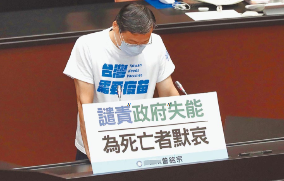臺灣本土新冠疫情已造成近700人確診死亡。國民黨“立委”曾銘宗在臺灣立法機構(gòu)發(fā)言臺向往生的民眾默哀。(圖片來源:臺灣《中國時報》)