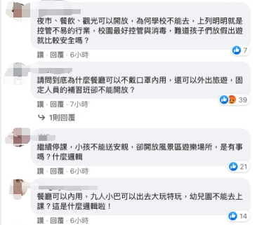 臺教育部門臉書更是被家長的批評、質(zhì)疑留言灌爆,許多家長都質(zhì)疑為什么健身房、電影院,甚至9人以下的旅游團(tuán)都可以開放,卻不能開放幼兒園、安親班、補(bǔ)習(xí)班,難道要家長一直請防疫假嗎?這些業(yè)者也到教育部門臉書上留言,批評臺當(dāng)局根本不顧幼兒園、補(bǔ)習(xí)班等的生計,痛批“吃喝玩樂可以,卻不能上課?”