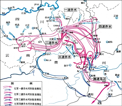 紅軍一渡赤水后,各路敵軍蜂擁而至,進(jìn)行圍追堵截。面對敵情變化,黨中央和中革軍委當(dāng)機立斷,暫緩執(zhí)行北渡長江計劃,在扎西地區(qū)集結(jié)。當(dāng)各路敵軍奔向扎西時,紅軍突然調(diào)頭東進(jìn),二渡赤水,再打遵義。敵人再次集結(jié)重兵,妄圖殲滅紅軍于遵義、鴨溪狹窄地區(qū)。沒想到,紅軍三渡赤水,佯作北渡長江之勢,迫使敵人重新調(diào)整部署。當(dāng)敵人部署尚未就緒時,紅軍又出敵不意四渡赤水,南渡烏江,兵臨貴陽直逼昆明,隨后巧渡金沙江,跳出了數(shù)十萬敵軍圍追堵截的包圍圈。